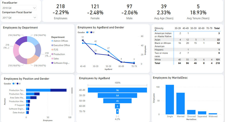 Built an interactive HR analytics dashboard using data sourced from Kaggle and transformed in Power Query. The dashboard tracks workforce demographics and trends between Fiscal Quarters and compares, here 2017 Q4 and 2018 Q4 are selected and compared, providing key insights for HR planning.Key Features:Cleaned and modelled raw HR data with Power Query for accurate analysis.Visualized KPIs including total employees, gender split, average age, and average tenure with year-over-year change.Delivered interactive charts for department headcount, age distribution, ethnicity breakdown, job roles by gender, and marital status.Enabled HR teams to monitor diversity, workforce structure, and demographic shifts over time.Tools & Skills: Power BI, Power Query, Data Cleaning, Data Modelling, KPI Design, Interactive Visuals